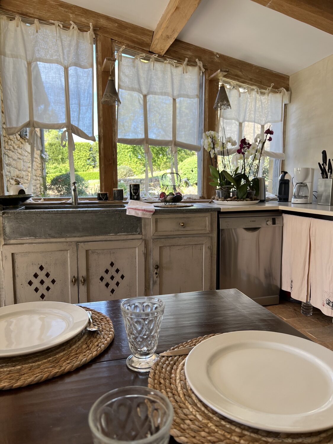 L’appentis de l’ancien four à pain a été transformé en salle à manger d’extérieur, équipée d’un barbecue Weber.