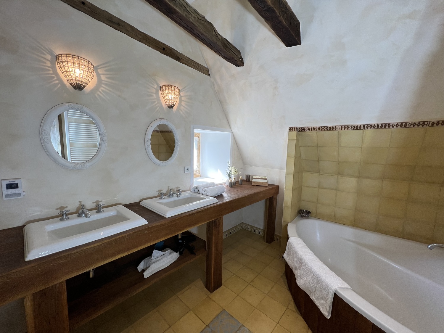 Une chambre, la Mansarde, un lit double de 160×200, et un lit simple de 90×190, dressing, salle de bains avec baignoire, un lavabo et WC dans la salle de bains.
