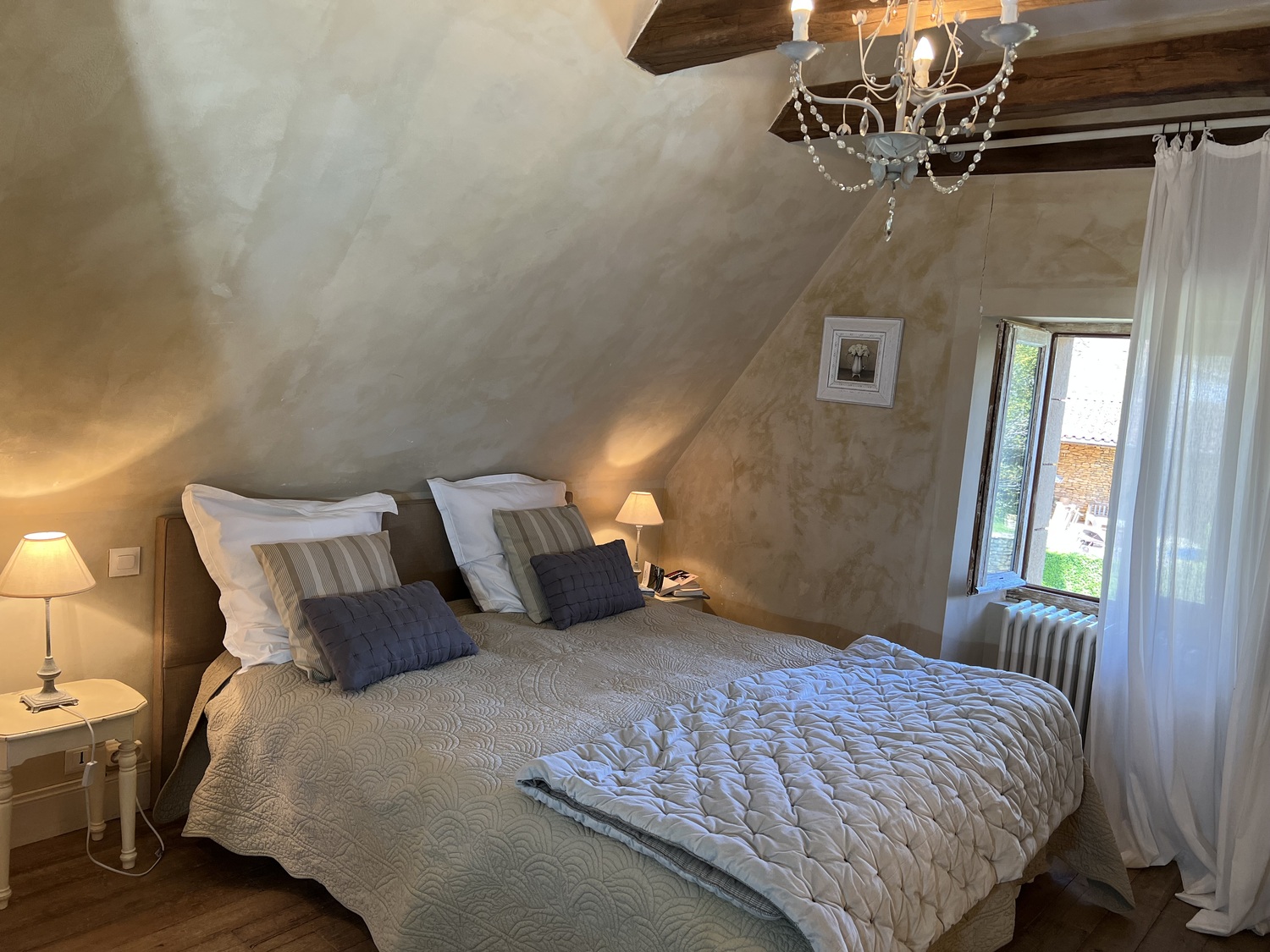 Une grande chambre, la suite Garance, un lit double de 160×200 avec cheminée, dressing, salle de bain avec baignoire, une double vasque, et WC indépendant.