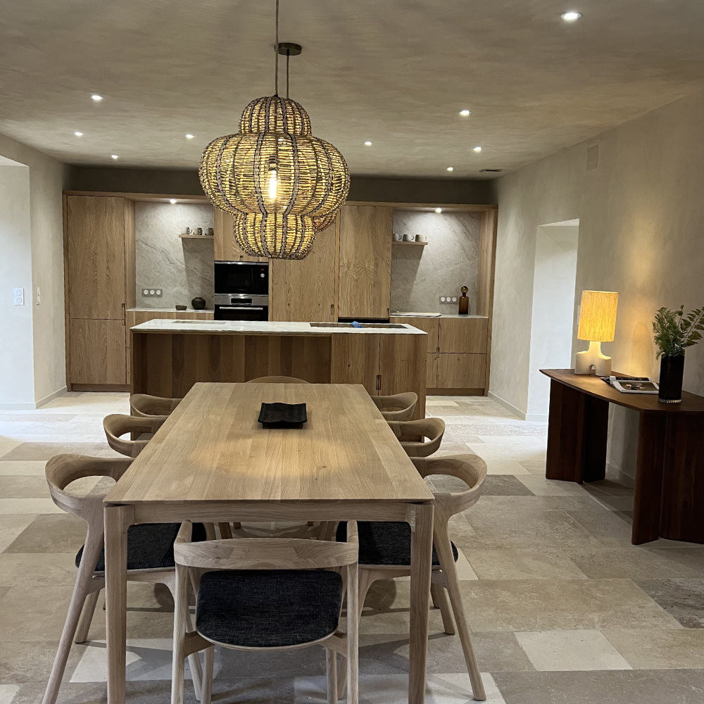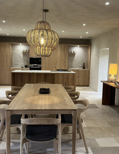 La vaste cuisine, réalisée sur mesure par un ébéniste d’art, se distingue par son plan de travail en quartzite, capable d’accueillir vos plats chauds. Entièrement équipée d’un matériel performant proche du niveau professionnel, elle comprend entre autres une plaque à induction avec hotte escamotable, un réfrigérateur à froid ventilé, une cave à