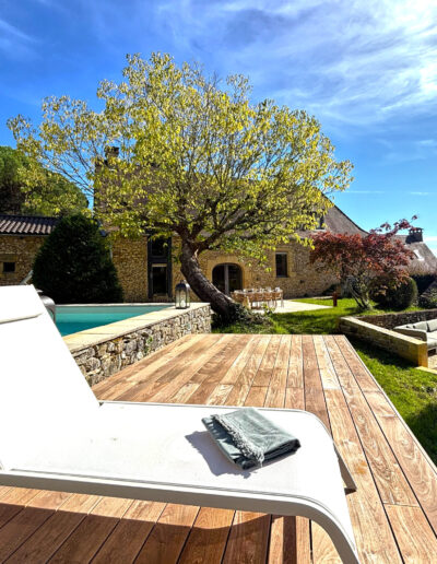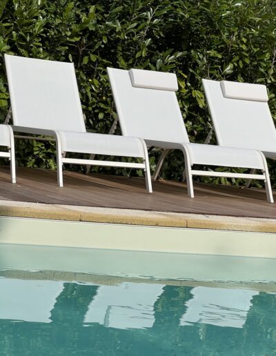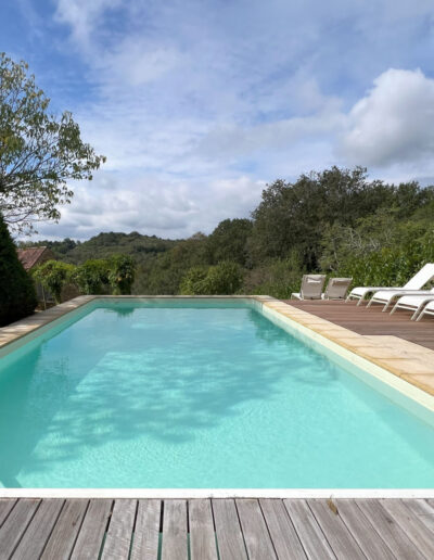 Grande piscine et une terrasse aménagée et équipée de transats.