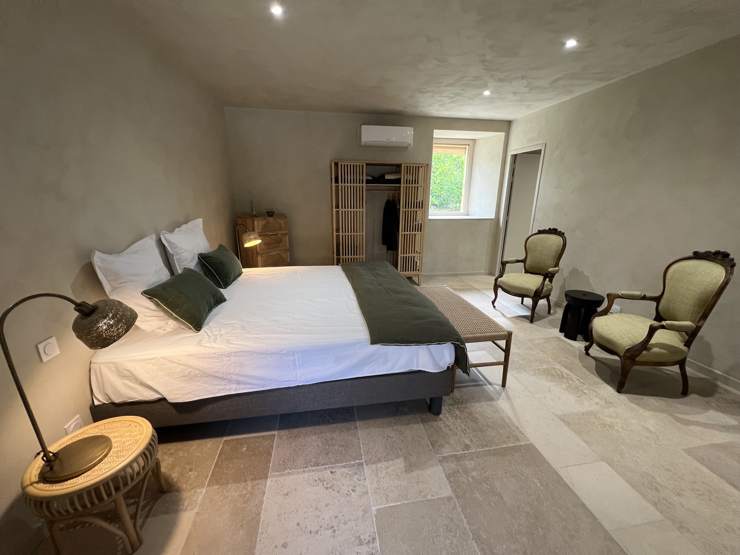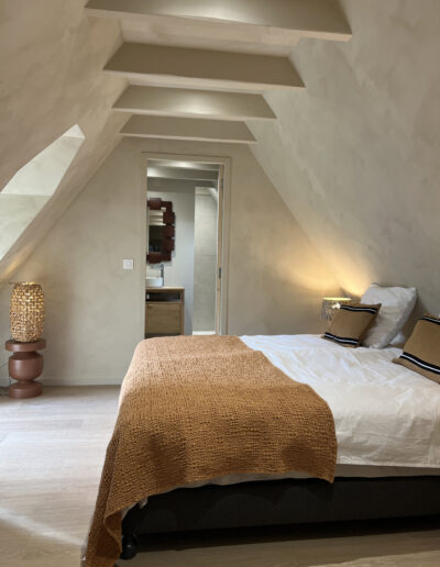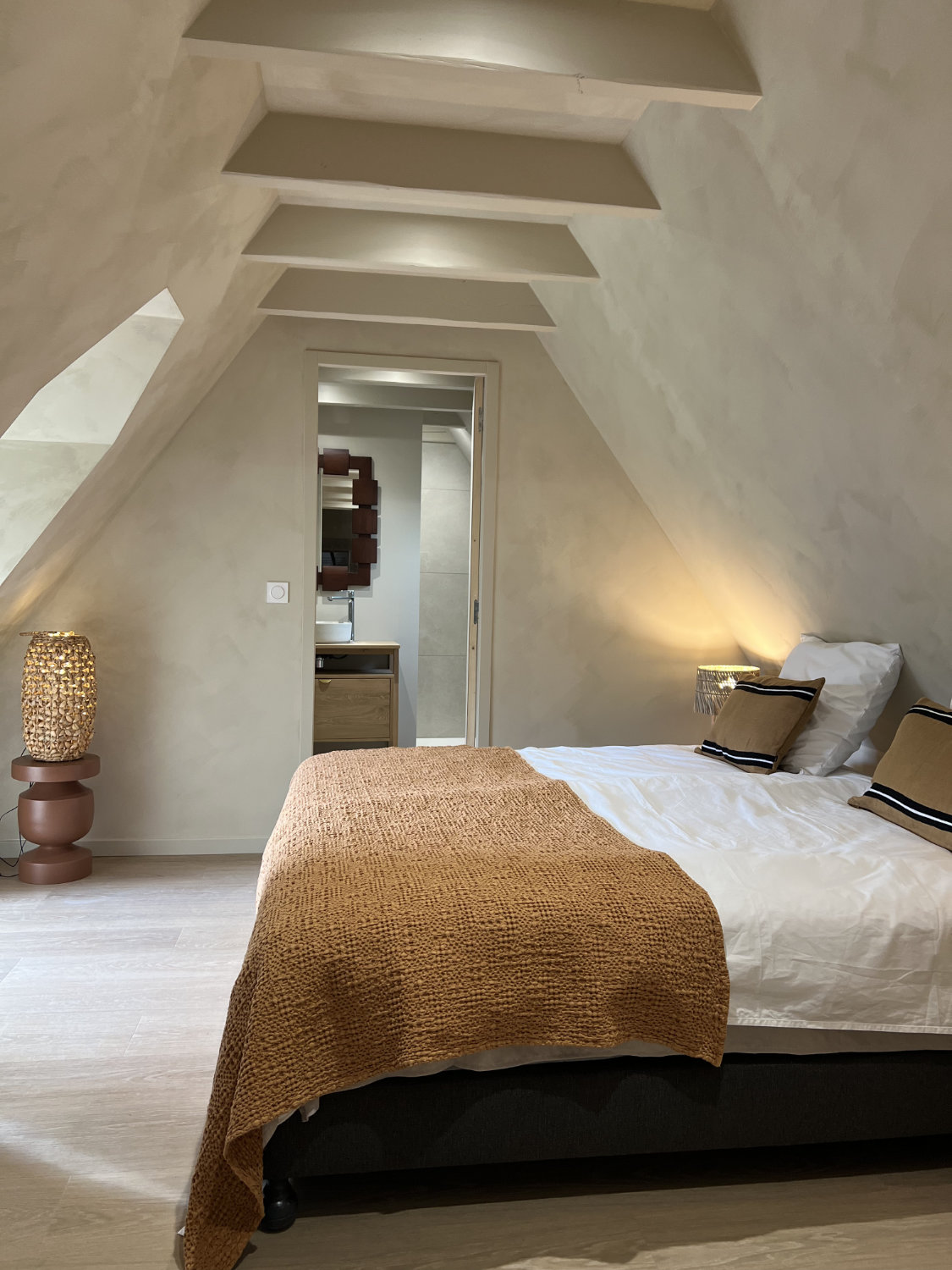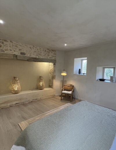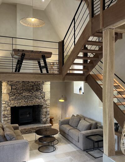 Ouverte sur la salle à manger au plafond cathédrale, la cuisine communique avec le salon, où une cheminée en pierre avec insert apporte une douce convivialité. La literie, de qualité hôtelière, promet des nuits paisibles, tandis que la vaisselle, choisie avec soinn pour s’accorder à la décoration, complète l’art de vivre du lieu.