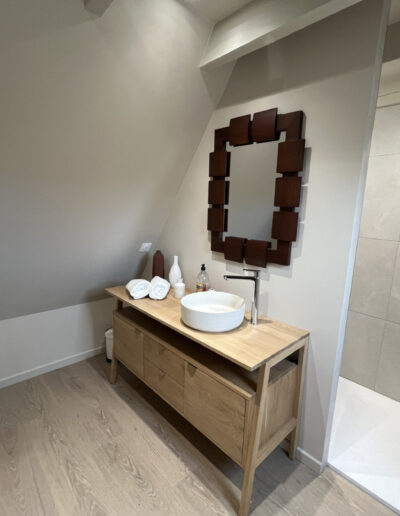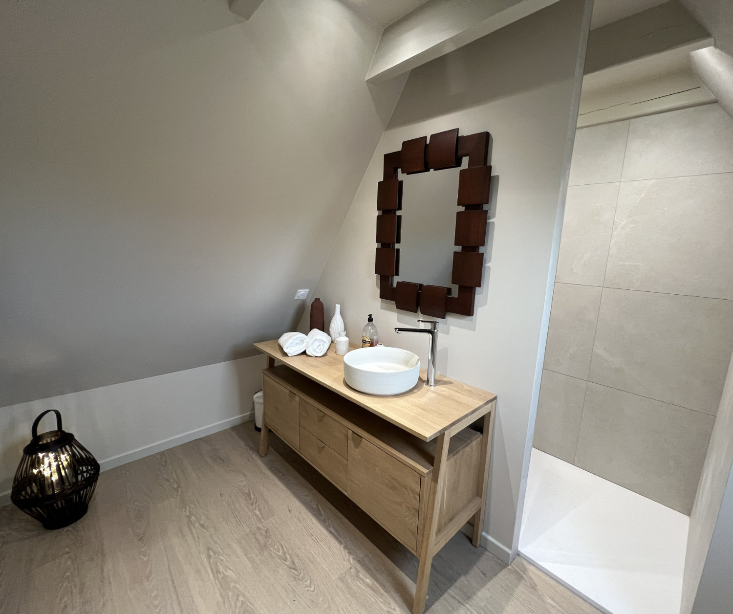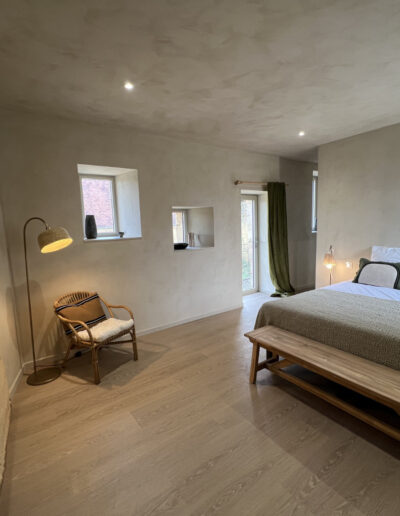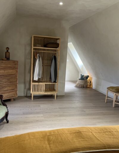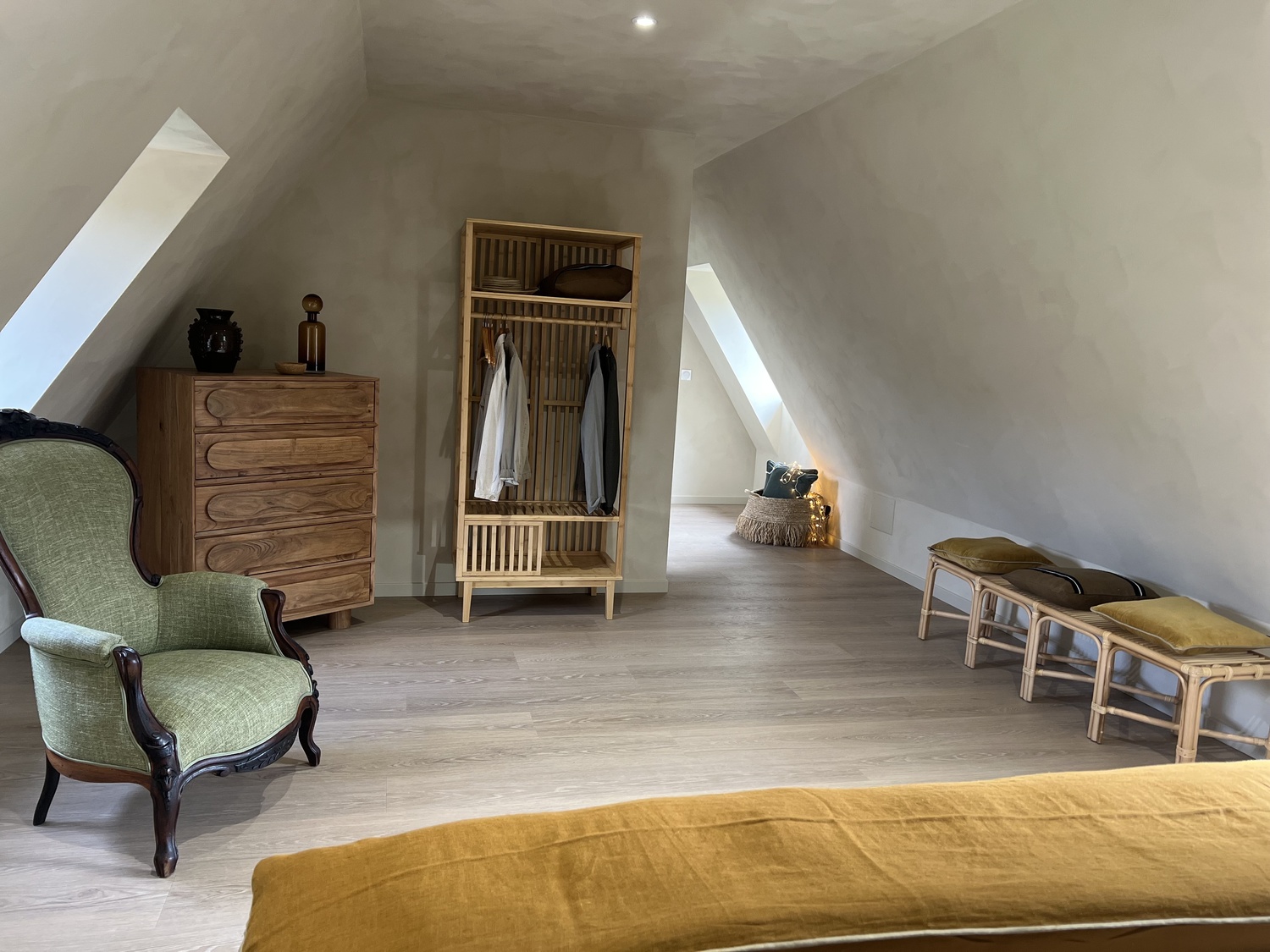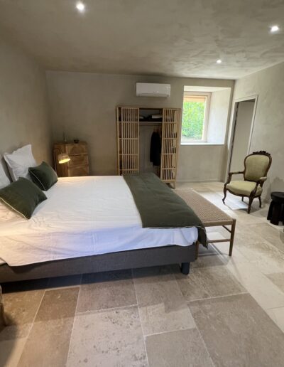 Ouverte sur la salle à manger au plafond cathédrale, la cuisine communique avec le salon, où une cheminée en pierre avec insert apporte une douce convivialité. La literie, de qualité hôtelière, promet des nuits paisibles, tandis que la vaisselle, choisie avec soinn pour s’accorder à la décoration, complète l’art de vivre du lieu.